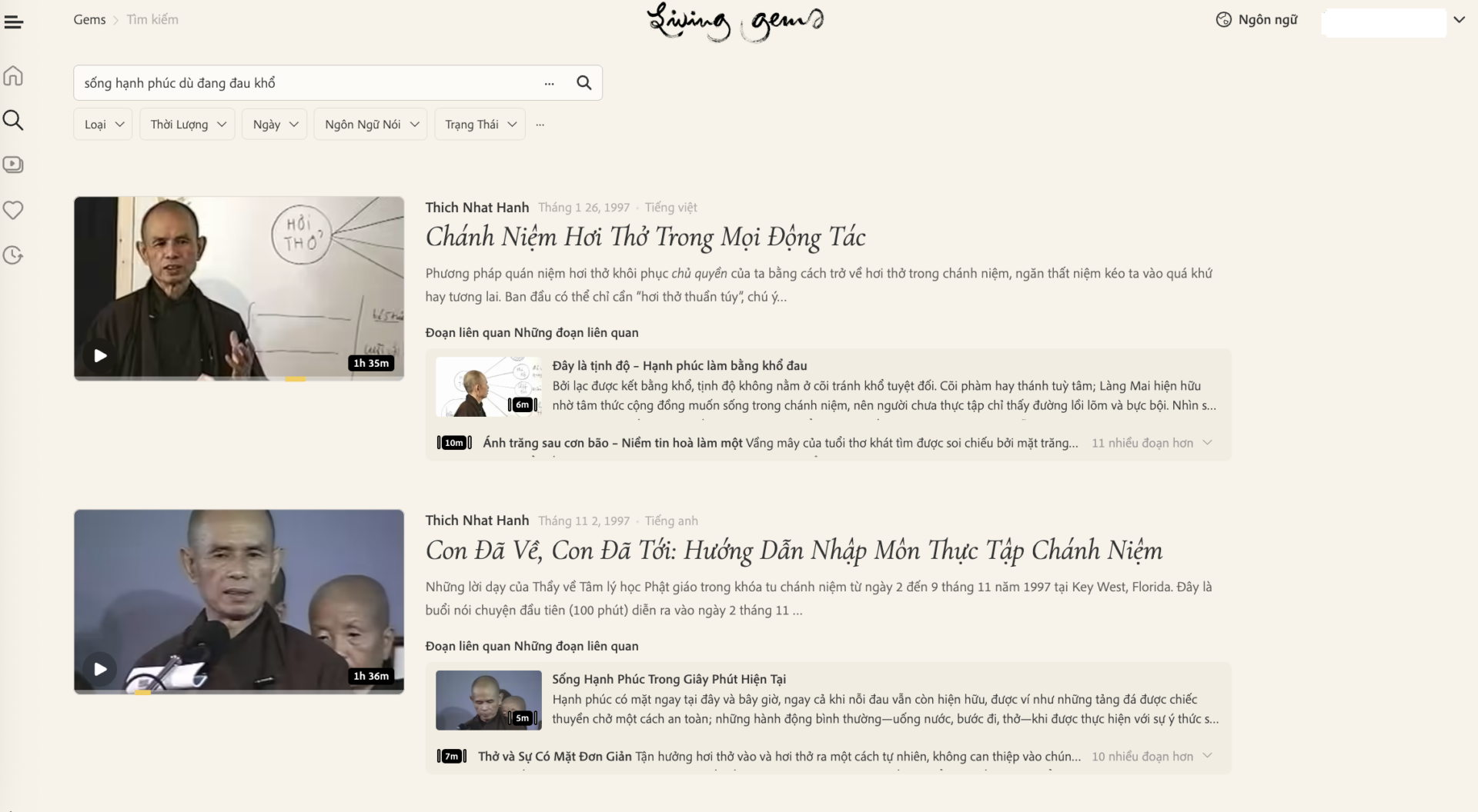 “Có những bài pháp giàu có và uyên áo nhất được Sư Ông nói bằng tiếng Việt. Và công cụ tìm kiếm của Living Gems cho phép chúng ta tìm các bài pháp thoại ấy một cách dễ dàng hơn rất nhiều.”